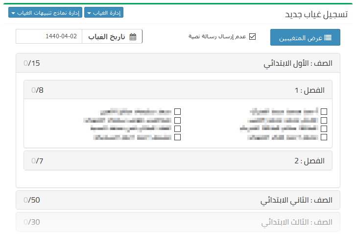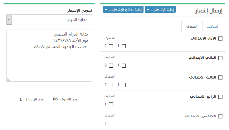 يتيح النظام إرسال إشعارات فورية عند تسجيل غياب الطالب أو عند الحاجة لإبلاغ ولي الأمر بمستجدات تخص ابنه، سواء لطالب واحد أو لصف كامل أو عدة صفوف.