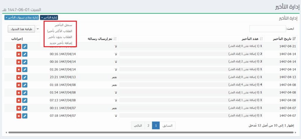 تتيح لك صفحة استعراض التأخير متابعة حالة التأخير لجميع الطلاب بسهولة، مع إمكانية عرض البيانات بعدة بطرق مختلفة وتحليلها لمتابعة الأداء بشكل دقيق.