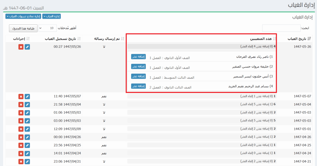 • تظهر قائمة باسماء الطلاب المتغييبين, انقر على الزر اضافة عذر امام الطالب المراد اضافة عذر غياب له.